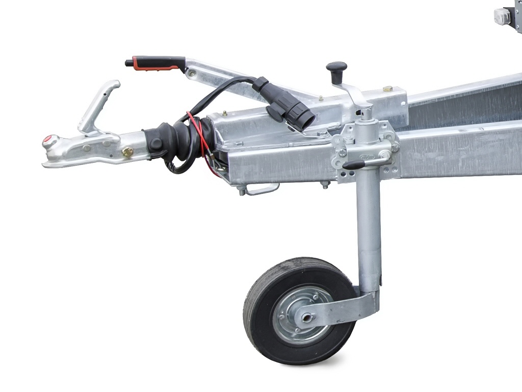 Dieser Anhänger ist mit einer V-förmigen Deichsel ausgestattet, mit der Sie sicher an Ihr Ziel fahren können.