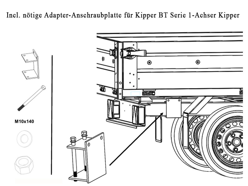 Im Set enthalten passende nötige Adapterplatte für 1-Achser Kipper Brenderup BT Serie.