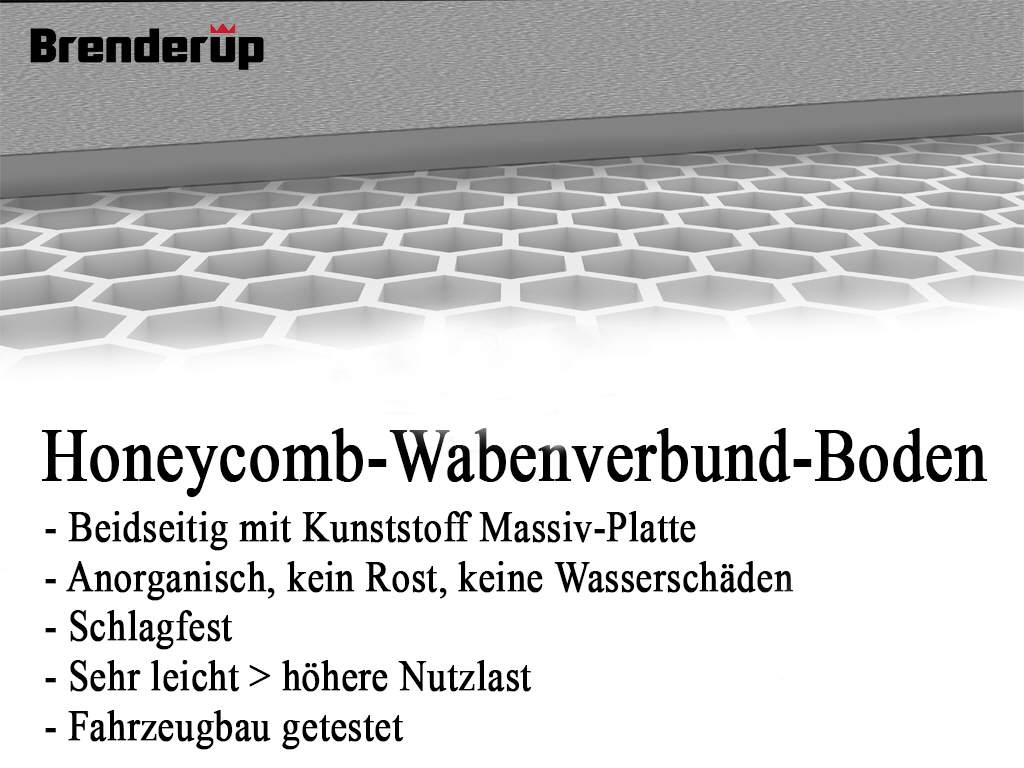 Honeycomb, Wabenverbund-Sandwich Boden mit beidseitiger Kunststoff-Hochlast Beplankung. Hochstabil und sogar schlagfest, ermöglicht für diese Klasse Anhänger ein extrem niedriges Eigengewicht und langlebigkeit.