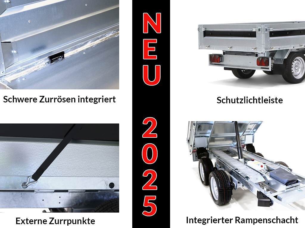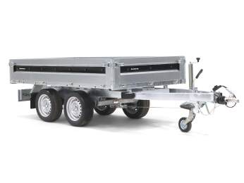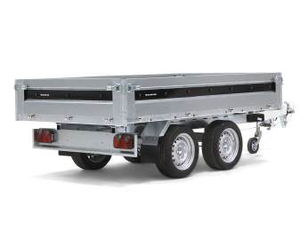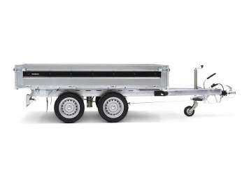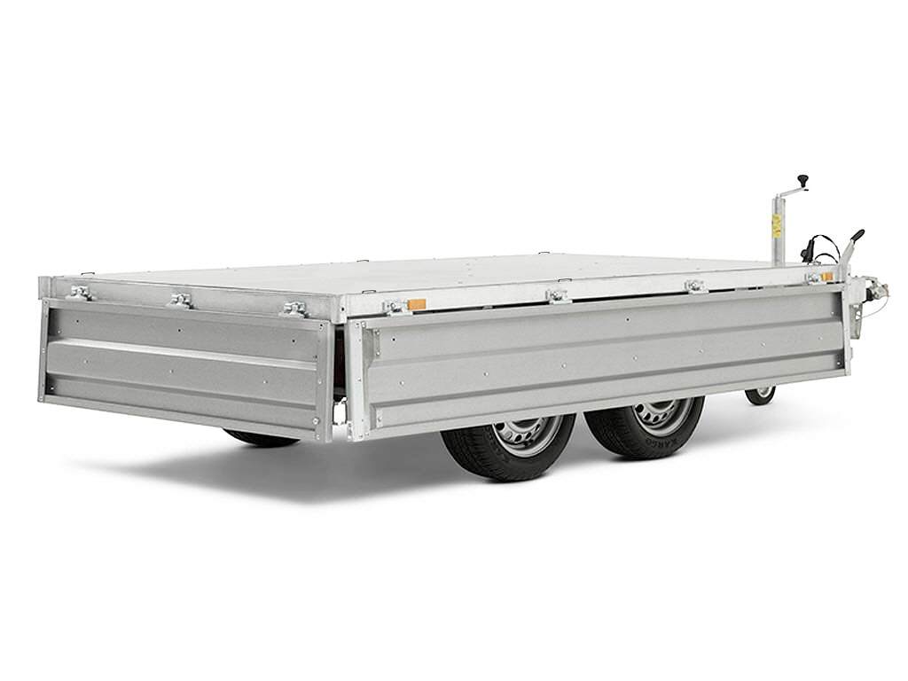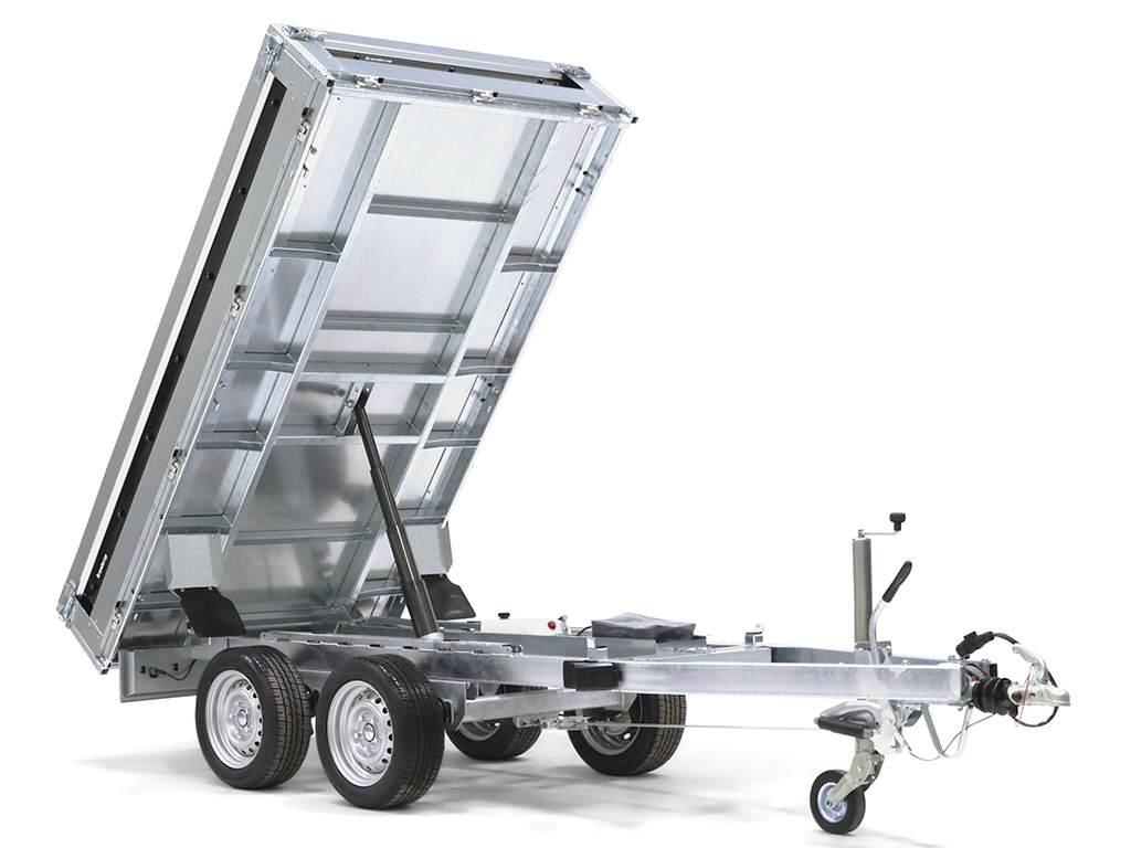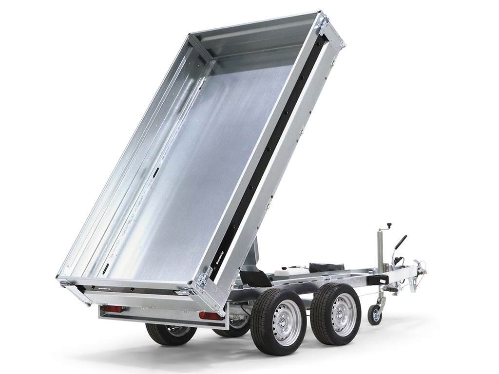 Ein perfekter Begleiter für den Unternehmer zum Transportieren und Kippen von Erde, Sand oder Kies. Ein robuster Rückwärtskipper als Doppelachser. Verstärkter Stahlboden mit elektrisch hydraulischer Kippvorrichtung für eine einfache Bedienung. Durch den hohen Kippwinkel der Ladefläche eignet sich der Anhänger zum Be- und Entladen von Kies, Holz und Baumaterial. Klappbare und abnehmbare Seiten, die montierten Planenknöpfe und die abnehmbaren Eckpfosten sind serienmäßig. 6 starke Verzurrösen sind im Stahlboden integriert. Der Anhänger kann zum z. B. mit einem Kastenaufsatz, einer Hochplane oder einem der anderen Zubehörteile, die in der Serie 4000 üblich sind, ausgestattet werden.