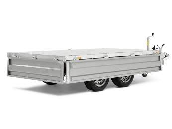 Ein perfekter Begleiter für den Unternehmer zum Transportieren und Kippen von Erde, Sand oder Kies. Ein robuster Rückwärtskipper als Doppelachser. Verstärkter Stahlboden mit elektrisch hydraulischer Kippvorrichtung für eine einfache Bedienung. Durch den hohen Kippwinkel der Ladefläche eignet sich der Anhänger zum Be- und Entladen von Kies, Holz und Baumaterial. Klappbare und abnehmbare Seiten, die montierten Planenknöpfe und die abnehmbaren Eckpfosten sind serienmäßig. 6 starke Verzurrösen sind im Stahlboden integriert. Der Anhänger kann zum z. B. mit einem Kastenaufsatz, einer Hochplane oder einem der anderen Zubehörteile, die in der Serie 4000 üblich sind, ausgestattet werden.