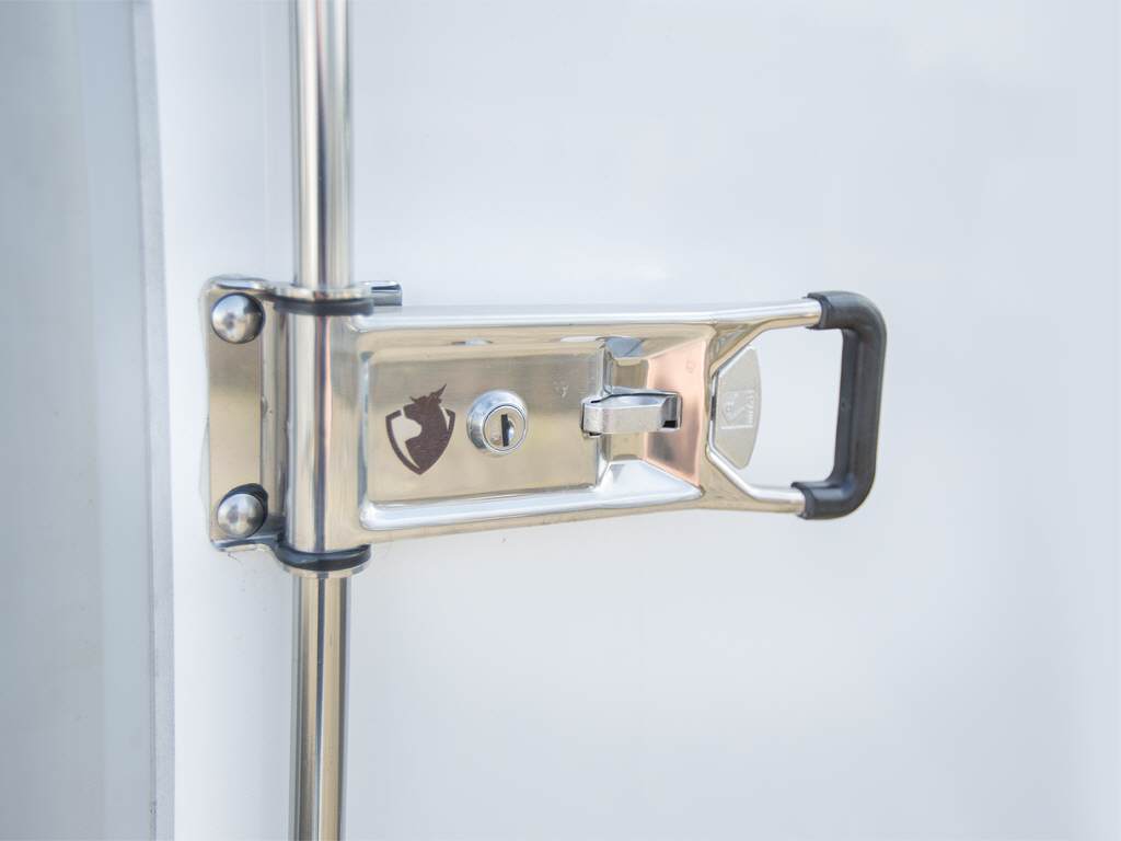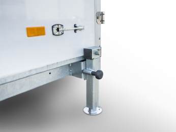 Die doppelflügeligen Kühltüren sind abschließbar. Sie sind über Edelstahlscharniere mit dem Anhängeraufbau verbunden. Rahmen und Fahrwerk sind aus feuerverzinktem Stahl gefertigt und vollverschweißt. Vier schwenkbare Teleskopkurbelstützen ermöglichen den sicheren Stand des PKW-Anhängers. Die Einfassungen bestehen aus eloxiertem Aluminium, ebenso die Regenrinne am Heck.